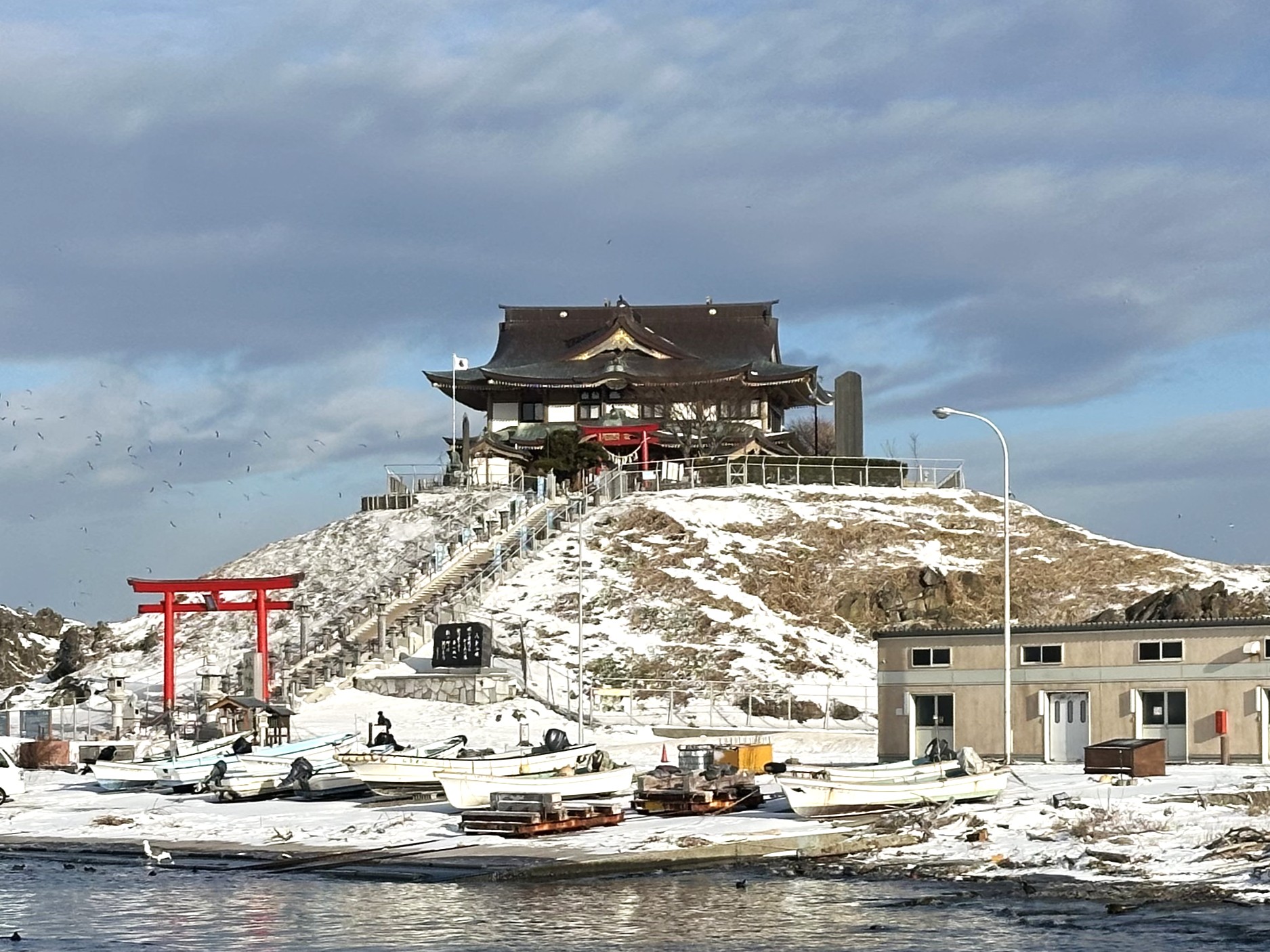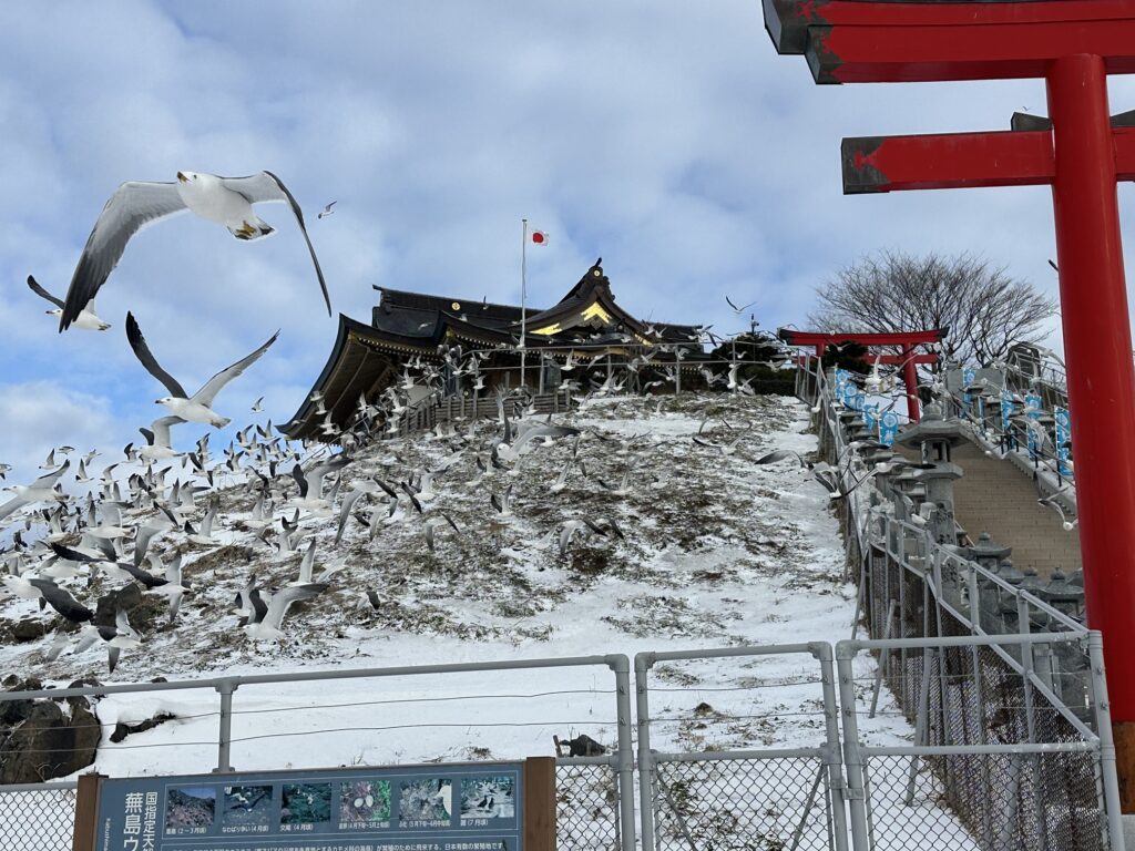 戦中に埋め立てられて現在は陸続きになっていますが、頂上に蕪嶋神社がある島全体がウミネコの繁殖地として天然記念物に指定されています。