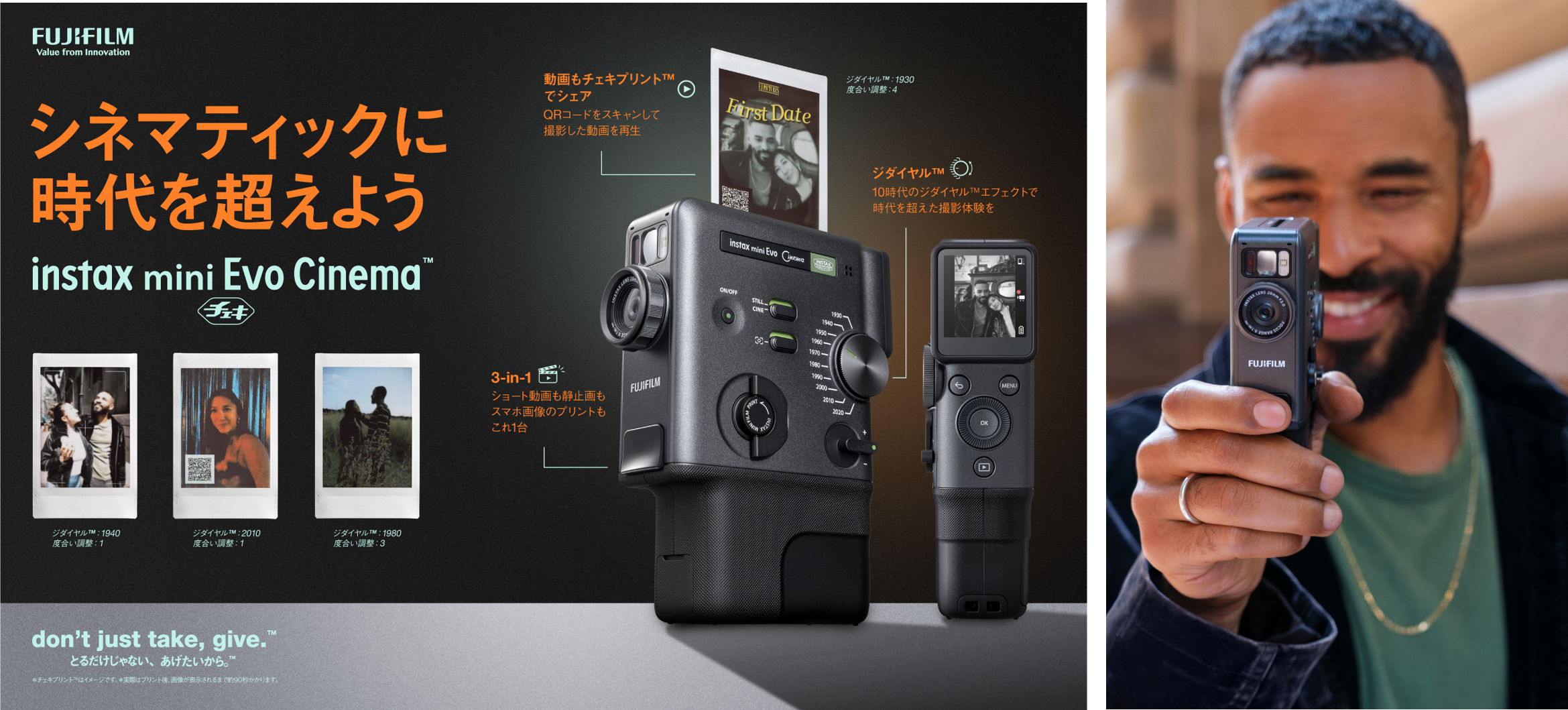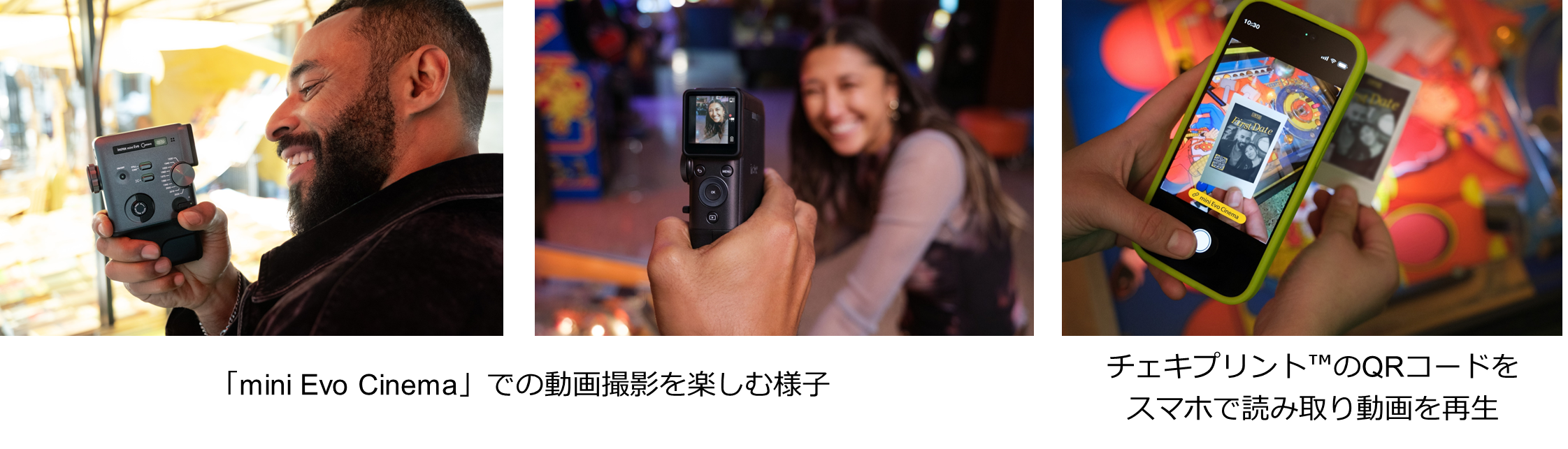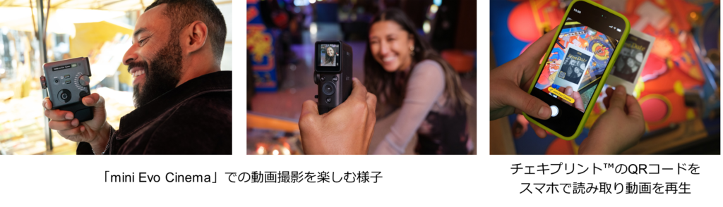 静止画と動画の撮影に加え、撮影したデータをQRコードにして、動画から切り出した静止画と一緒にチェキとしてプリントできるというもの。